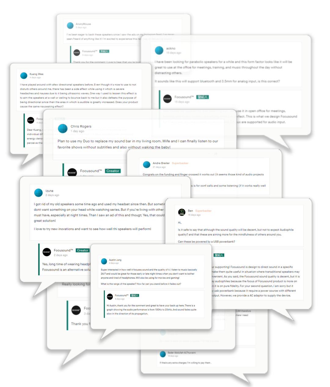 众筹期间,比起数据成绩,更让人惊喜的是Focusound™聚音屏持续升温的讨论热度。自kickstarter众筹开启后,Focusound™聚音屏收到了来自世界各地发烧友的强烈关注。他们迫不及待地表示想要体验聚音屏,热情回应着这款会定向发声的“黑科技”音箱。