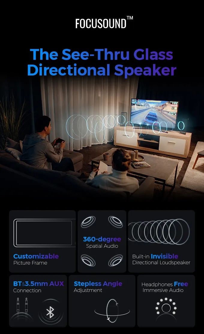 Focusound™采用清听声学全球创新研发的屏幕定向发声专利技术,在创造个性化独立音区的同时,拥有360°环绕立体声的音效体验,带来前所未有的听音享受。全新的超薄、无孔化设计,采用定制级全透明复合材料,厚度仅约0.1mm,完美平衡了美学设计与科技格调,作为科技家居产品,日常也可以作为便签夹或装饰摆台,满足多样化DIY创意。