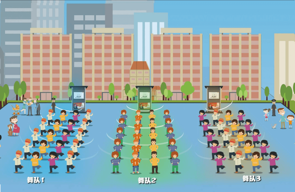( 多舞队同时热舞,互不干扰,也实现了广场舞不扰民 )